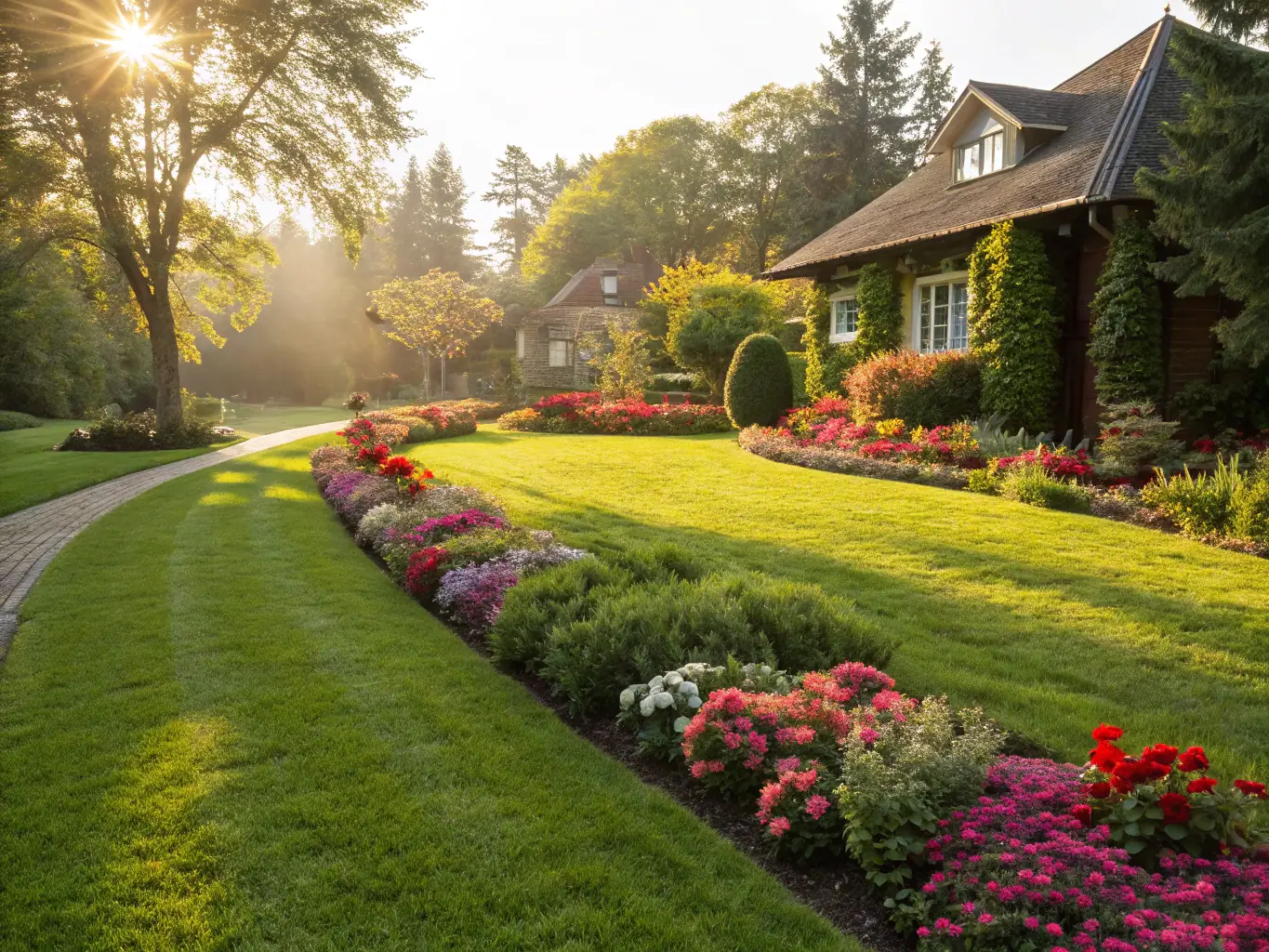 Elegancki ogród dla luksusowej willi, obejmujący zadbany trawnik, ozdobne rabaty kwiatowe i kamienne patio do rozrywki na świeżym powietrzu.