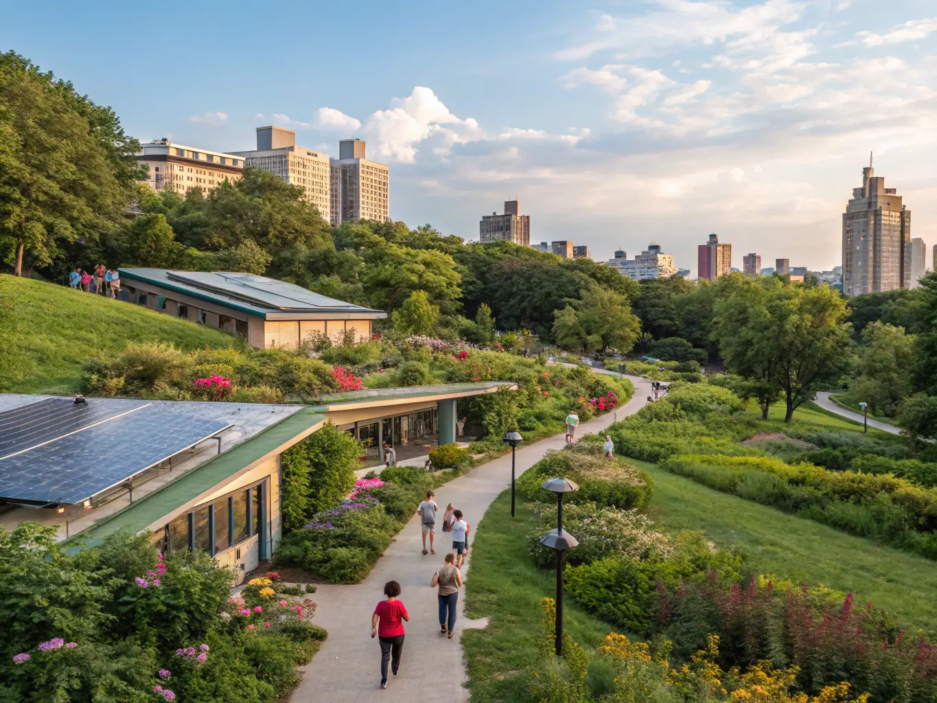 Nowoczesny park miejski ze ścieżkami spacerowymi, rodzimą roślinnością i ekologicznymi rozwiązaniami, tworzący zieloną oazę w miejskim otoczeniu.