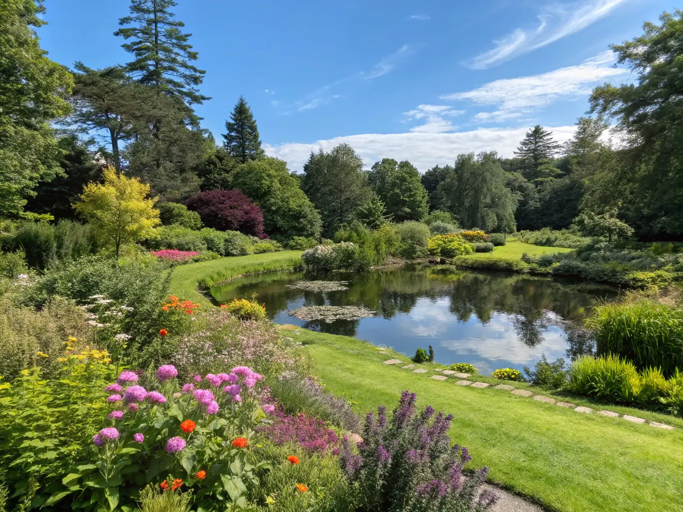- Spokojny ogród z oczkiem wodnym, bujną zielenią i drewnianą ławką z widokiem na wodę.